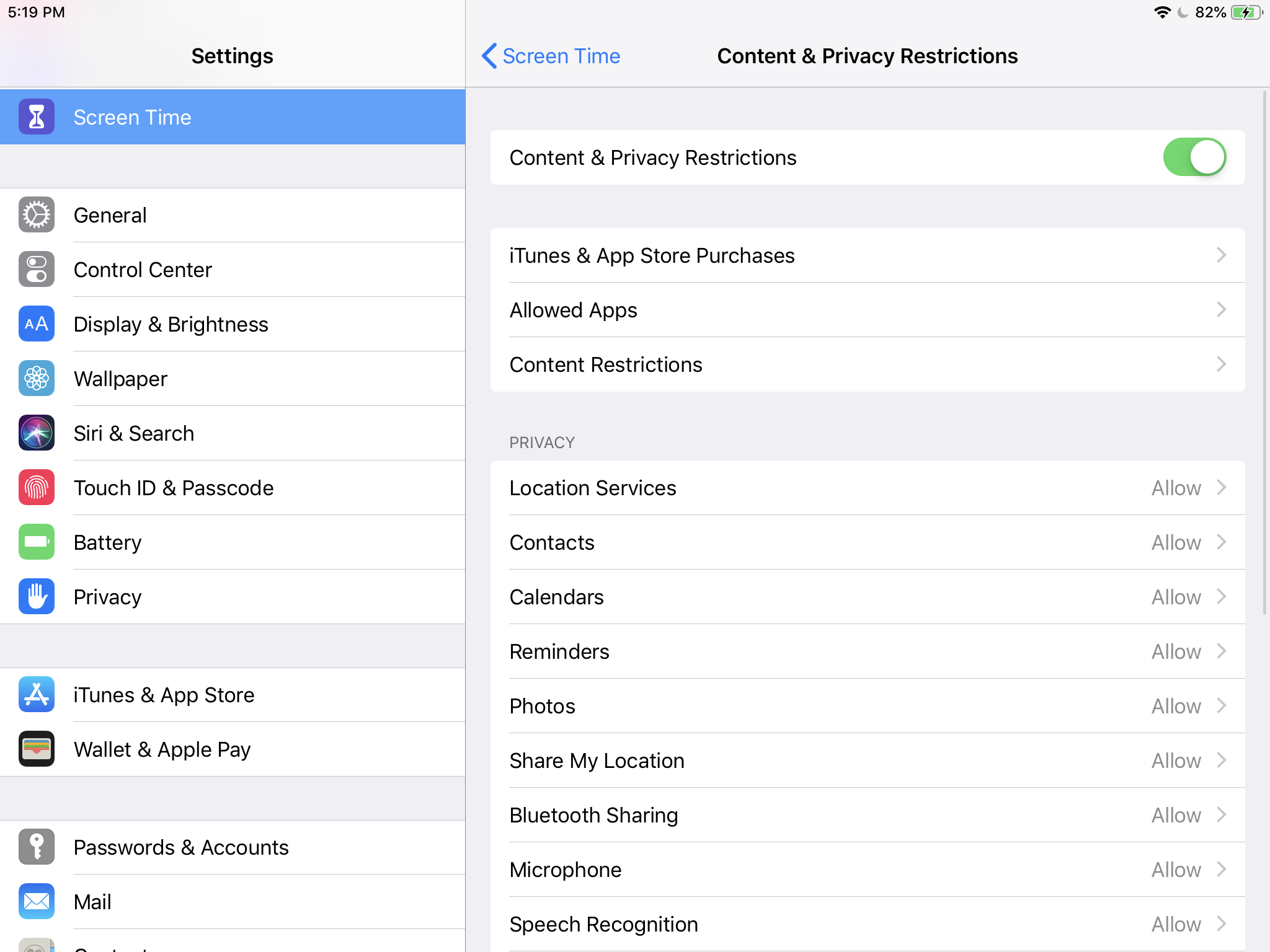 In the menu on the left of the screen, tap Screen Time and tap Content and Privacy Restrictions.